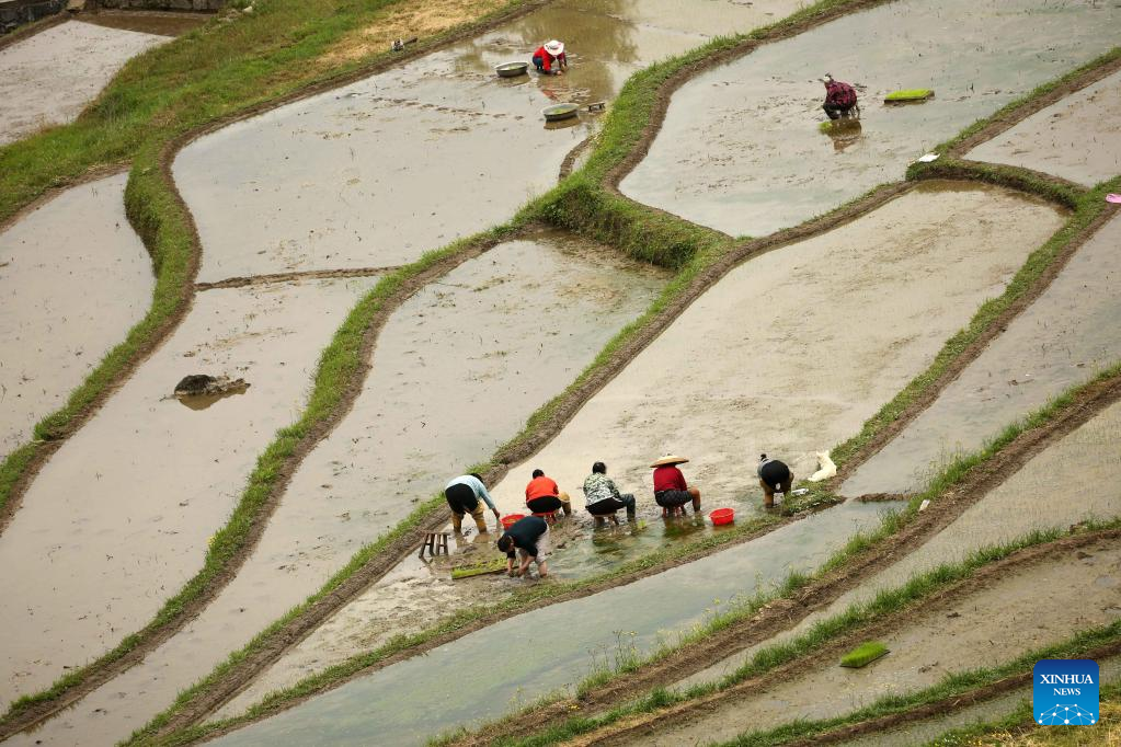 Villagers work in a field in Panzhihua Township of Yuanyang County, southwest China's Yunnan Province, April 24, 2022. (Photo by Zhang Hongke/Xinhua)