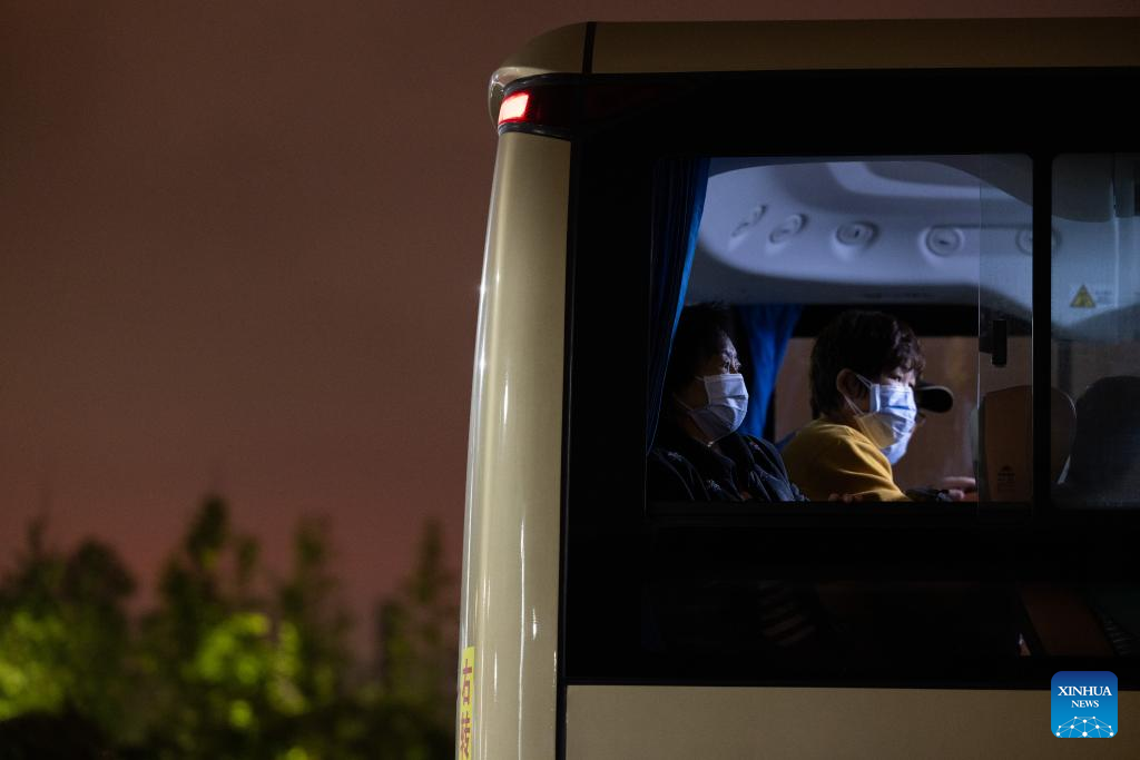 Huang Dongfang (L) takes a bus to return home from a makeshift hospital in Shanghai, east China, April 23, 2022. Huang Dongfang, who lives in a three-and-a-half-story old apartment in Guangfu residential area, recovered from COVID-19 infection and returned her home on Saturday evening. (Xinhua/Jin Liwang)