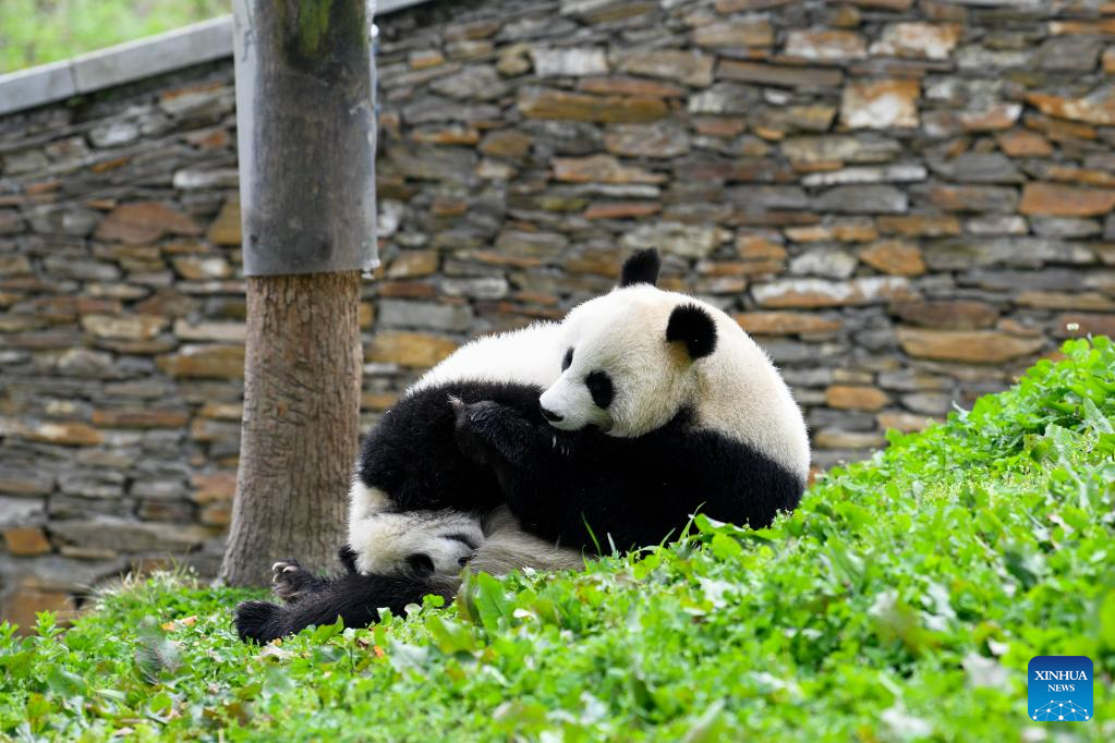 Giant pandas are seen at Shenshuping base of China Conservation and Research Center for Giant Pandas in Wolong National Nature Reserve, southwest China's Sichuan Province, April 24, 2022. (Xinhua/Xu Bingjie)