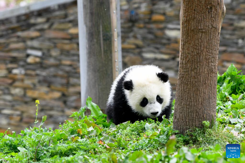 A giant panda is seen at Shenshuping base of China Conservation and Research Center for Giant Pandas in Wolong National Nature Reserve, southwest China's Sichuan Province, April 24, 2022. (Photo by Chen Juwei/Xinhua)