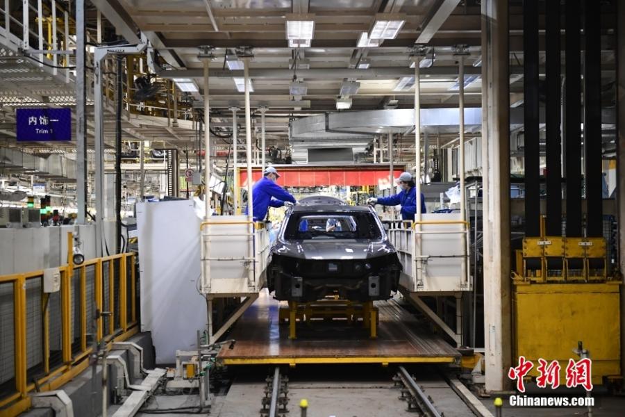Employees work at a car production line in east China's Shanghai, April 23, 2022. More than 700 vehicles rolled off the production line since April 19 after the company resumed operation. (Photo: China News Service/Tian Yuhao)