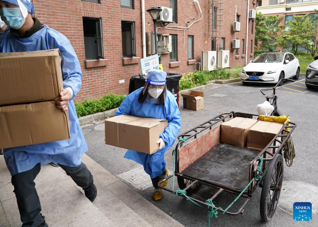 Staff members carry supplies for residents in a community of Pudong New Area, east China's Shanghai, April 19, 2022.