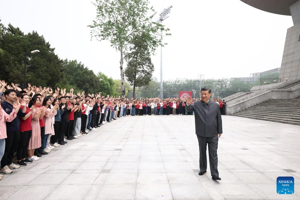 Chinese President Xi Jinping, also general secretary of the Communist Party of China Central Committee and chairman of the Central Military Commission, waves to teachers and students during a visit to Renmin University of China in Beijing, capital of China, April 25, 2022. (Xinhua/Ju Peng)
