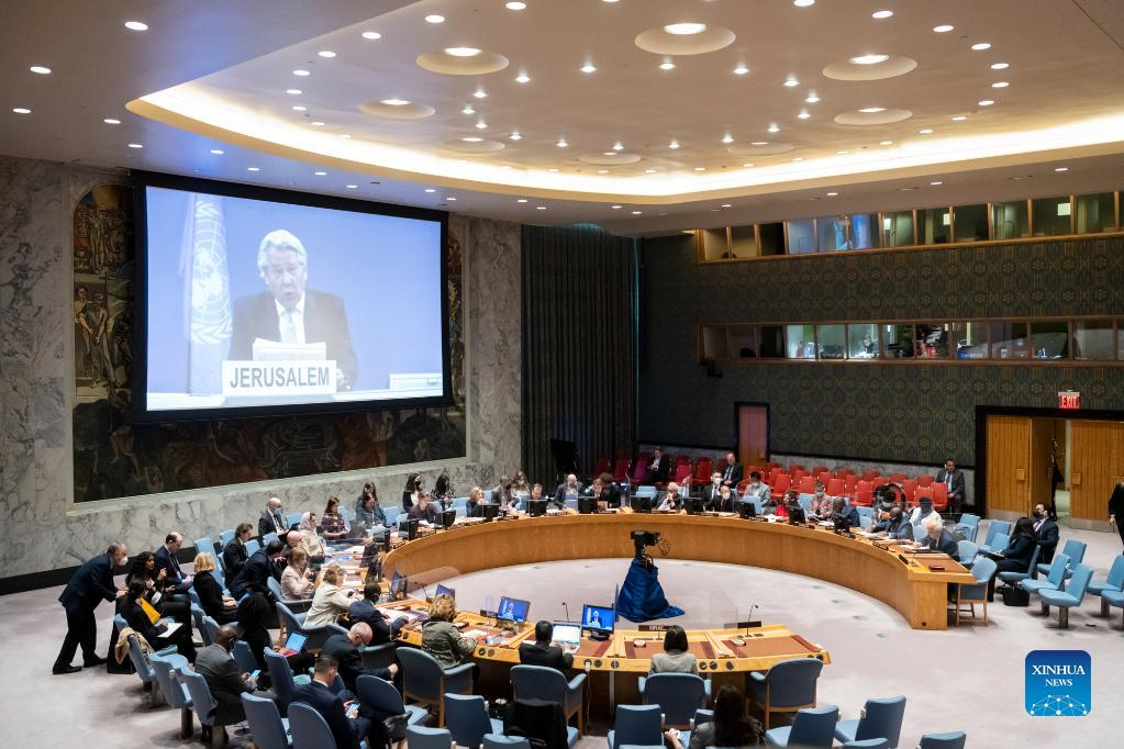 UN Special Coordinator for the Middle East Peace Process Tor Wennesland (on screens) speaks via a video link at a Security Council meeting on the situation in the Middle East, including the Palestinian question, at the UN Headquarters in New York on April 25, 2022. Tor Wennesland on Monday called for real progress in the peace process to stem violence. (Mark Garten/UN Photo/Handout via Xinhua)