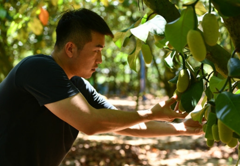 A businessman from Taiwan checks mango trees in an orchard in south China’s Hainan province. (Photo/Chinanews.com)