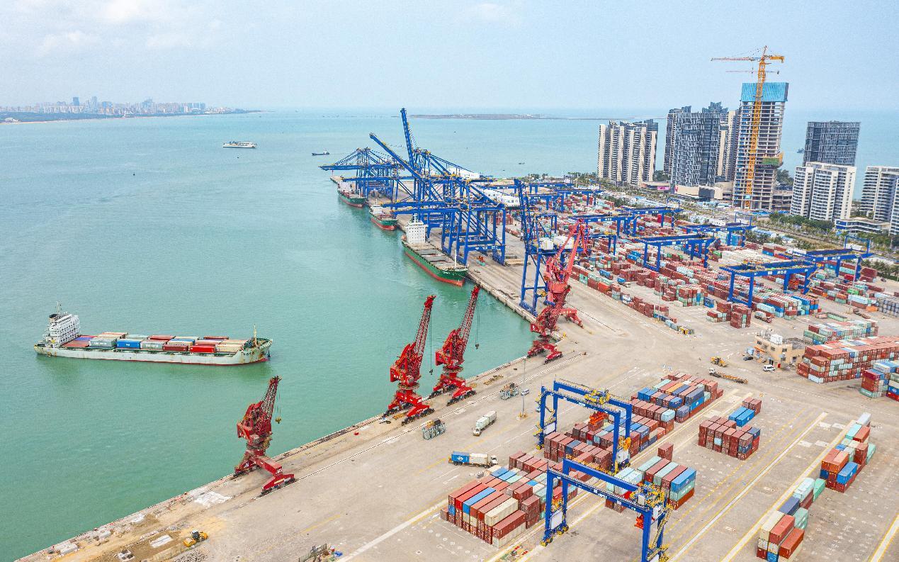 Photo taken on March 16, 2022 shows a cargo vessel sailing into a container terminal of Haikou Port in Haikou city, capital of south China’s Hainan province. (People’s Daily Online/Wang Chenglong)