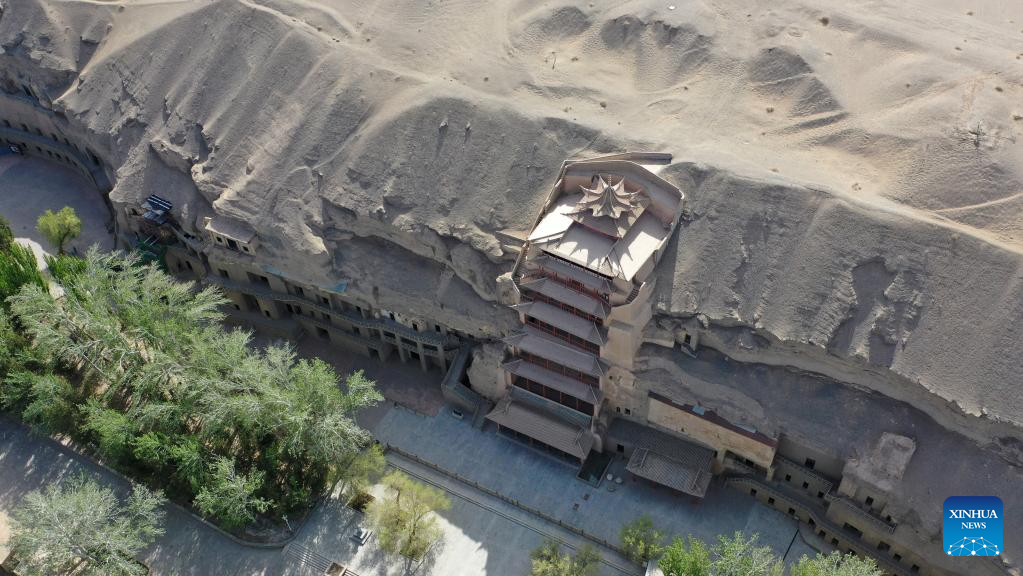 Aerial photo taken on April 19, 2022 shows the Mogao Grottoes in Dunhuang, northwest China's Gansu Province. Located in Dunhuang, northwest China's Gansu Province, the millennium-old Mogao Grottoes are home to a vast collection of Buddhist artworks which are considered the finest in existence -- more than 2,000 colored sculptures and 45,000 square meters of murals -- in 735 caves carved along a cliff by ancient worshippers.