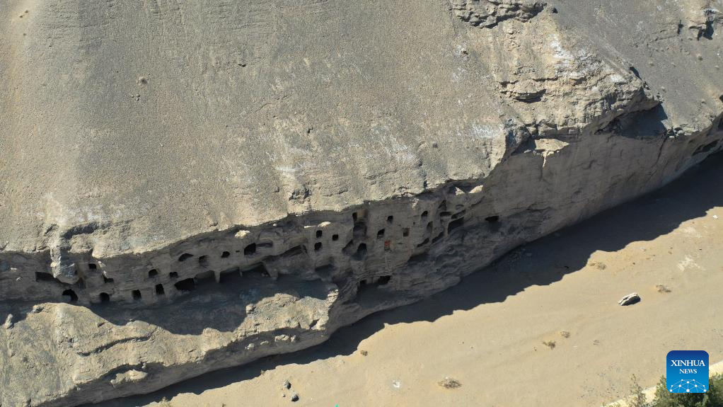 Aerial photo taken on April 18, 2022 shows the Mogao Grottoes in Dunhuang, northwest China's Gansu Province. Located in Dunhuang, northwest China's Gansu Province, the millennium-old Mogao Grottoes are home to a vast collection of Buddhist artworks which are considered one of the finest in existence -- more than 2,000 colored sculptures and 45,000 square meters of murals -- in 735 caves carved along a cliff by ancient worshippers.