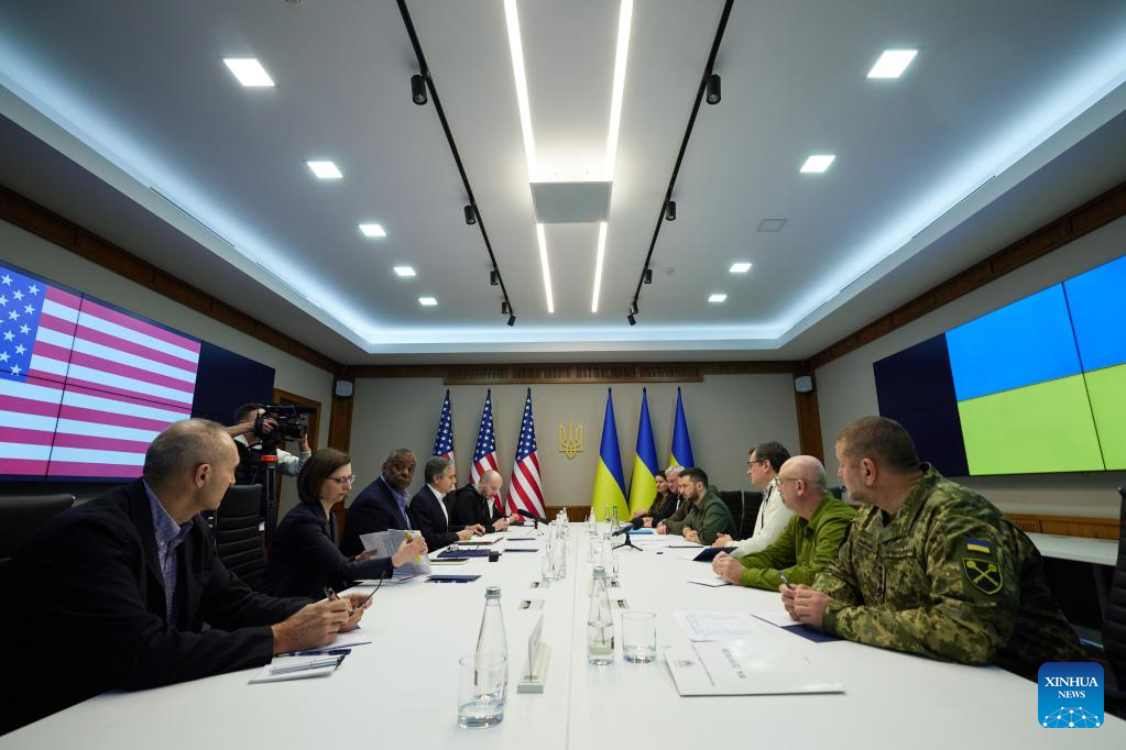 KIEV, April 25 (Xinhua) -- Ukrainian President Volodymyr Zelensky and visiting U.S. Secretary of State Antony Blinken and U.S. Defense Secretary Lloyd Austin met in Kiev to discuss Washington's assistance for Ukraine, the presidential press service said Monday.