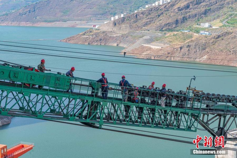 Construction workers remove the world's largest cable crane group at Baihetan Hydropower Station, in southwest China, April 25, 2022. (Photo: China News Service/Zhao Jian)