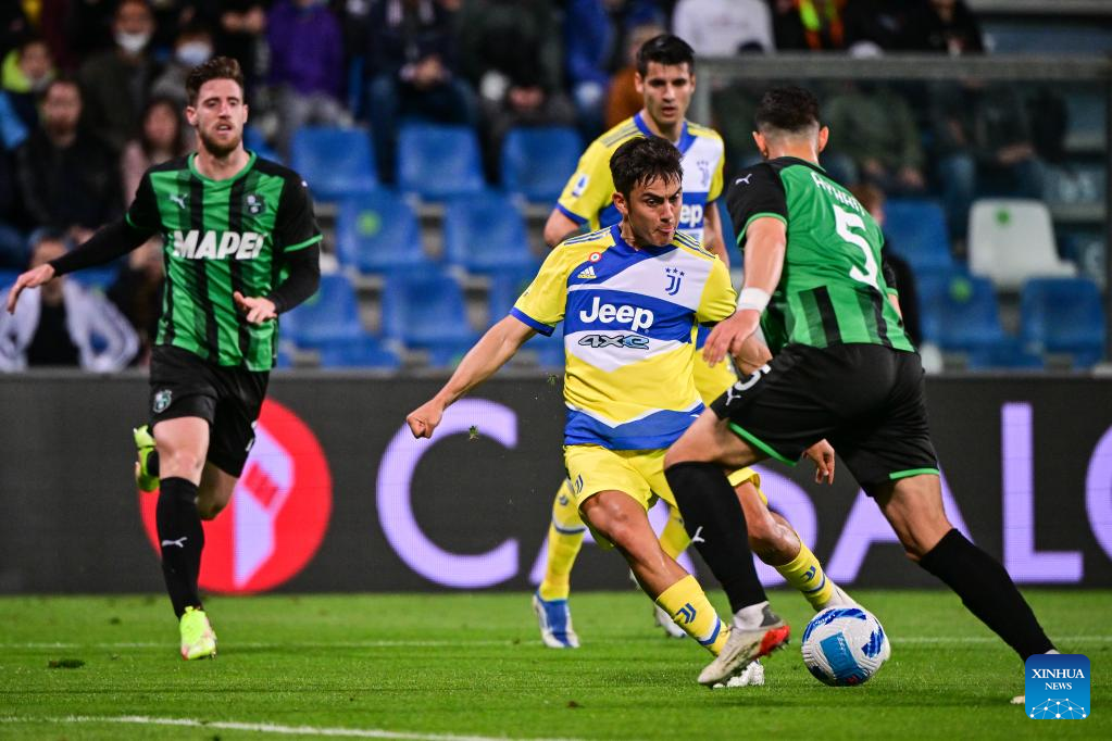 Juventus' Paulo Dybala (2nd R) shoots and scores during a Serie A football match between Sassuolo and FC Juventus in Reggio Emilia, Italy, on April 25, 2022. (Photo by Federico Tardito/Xinhua)