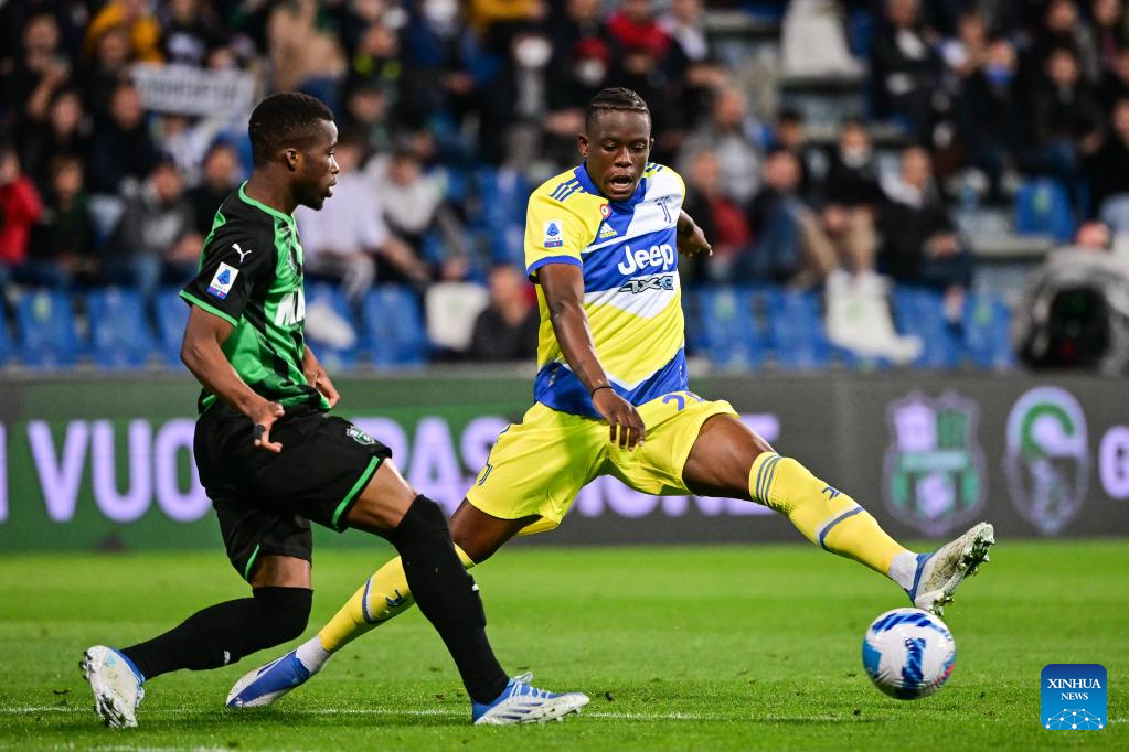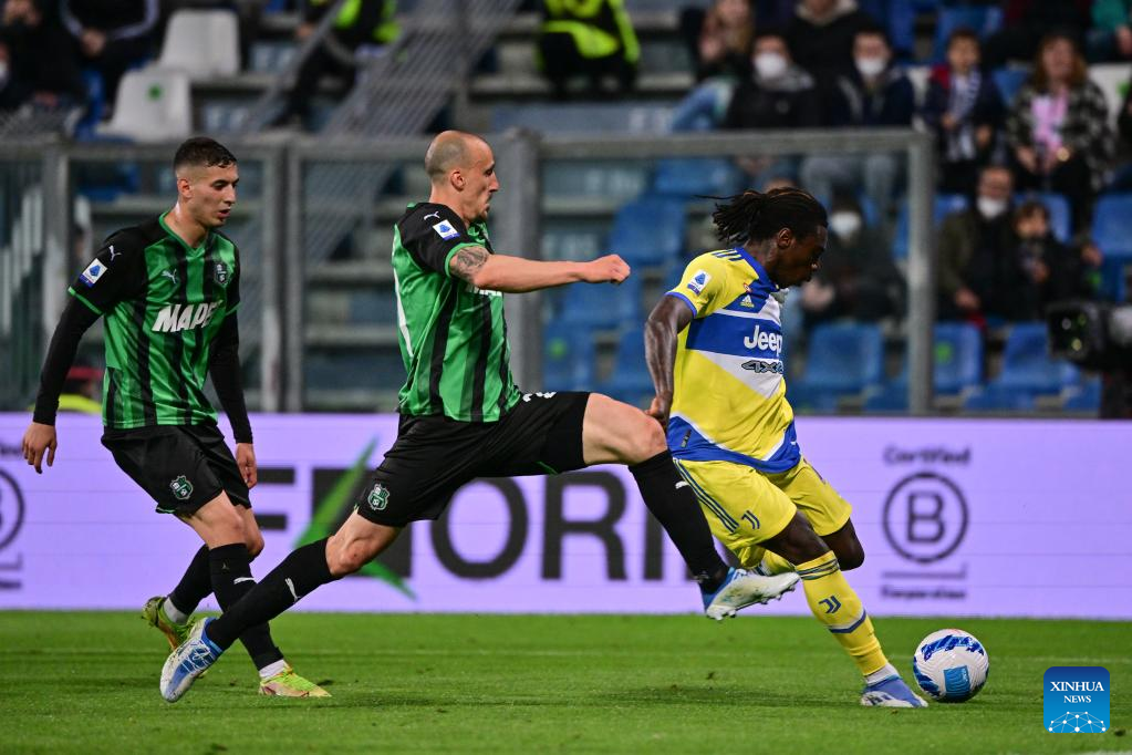 Juventus' Moise Kean (R) shoots and scores during a Serie A football match between Sassuolo and FC Juventus in Reggio Emilia, Italy, on April 25, 2022. (Photo by Federico Tardito/Xinhua)