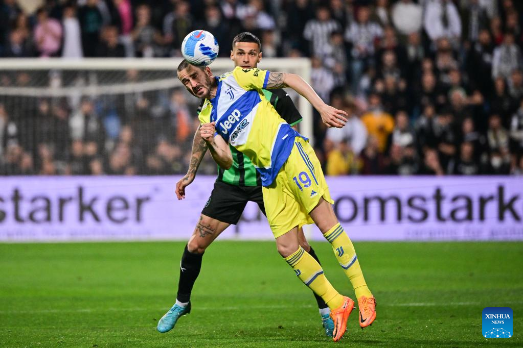 Juventus' Leonardo Bonucci (front) vies with Sassuolo's Gianluca Scamacca during their Serie A football match in Reggio Emilia, Italy, on April 25, 2022. (Photo by Federico Tardito/Xinhua)