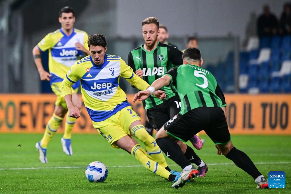 Juventus' Dusan Vlahovic (front L) controls the ball during a Serie A football match between Sassuolo and FC Juventus in Reggio Emilia, Italy, on April 25, 2022. (Photo by Federico Tardito/Xinhua)