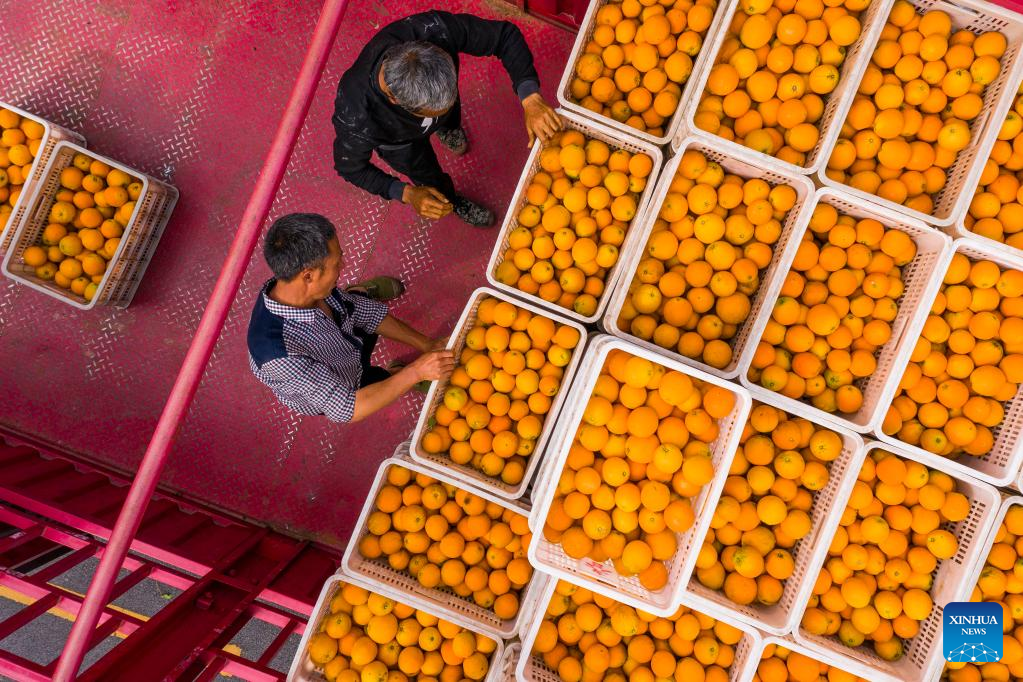 Villagers harvest oranges in Zigui County, C China's Hubei