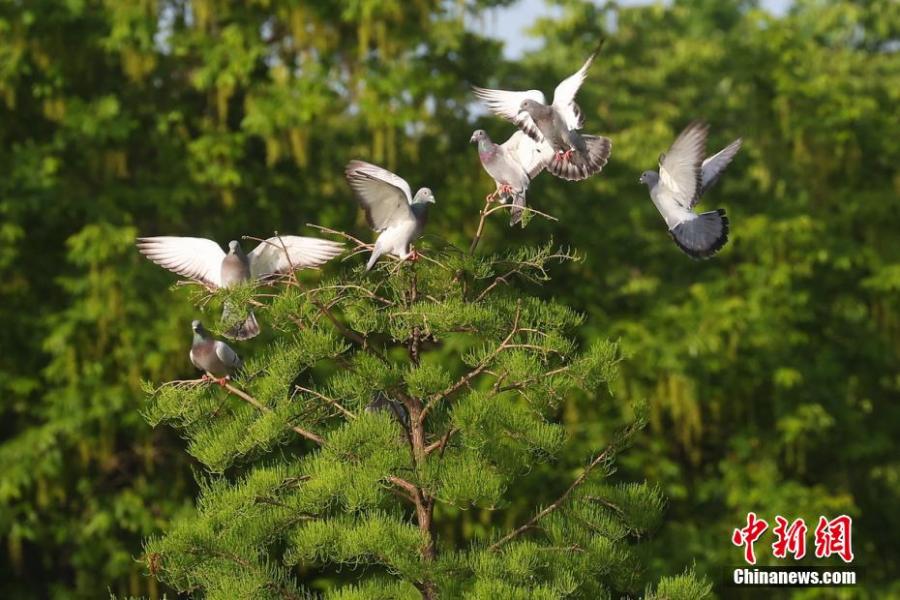 Pigeons rest on tree branches near the Yanque Lake in Nanjing, east China's Jiangsu Province, April 26, 2022. (Photo: China News Service/Yang Bo)