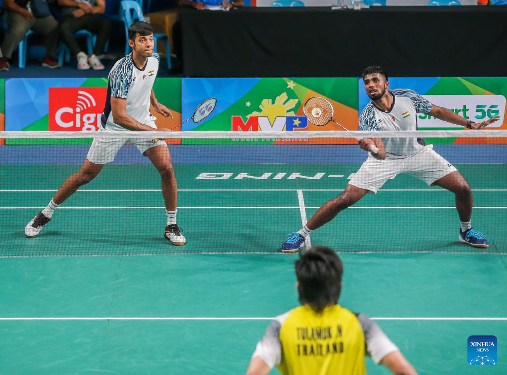 Satwiksairaj Rankireddy/Chirag Shetty of India compete during the men's doubles 1st round match against Apiluk Gaterahong/Natchanon Tulamok of Thailand at the Badminton Asia Championships 2022 in Manila, the Philippines, April 26, 2022. (Xinhua/Rouelle Umali)