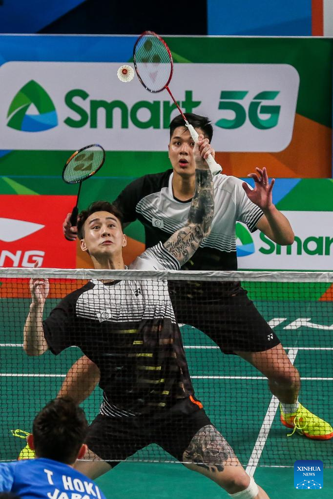 Taichi Saito (R)/Akira Koga of Japan compete during the men's doubles first round match against Muhammad Shohibul Fikri/Bagas Maulana of Indonesia at the Badminton Asia Championships 2022 in Manila, the Philippines on April 26, 2022. (Xinhua/Rouelle Umali)
