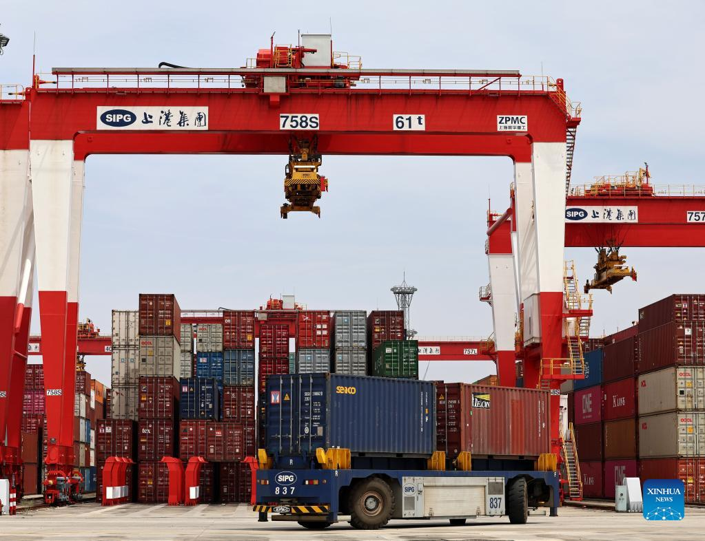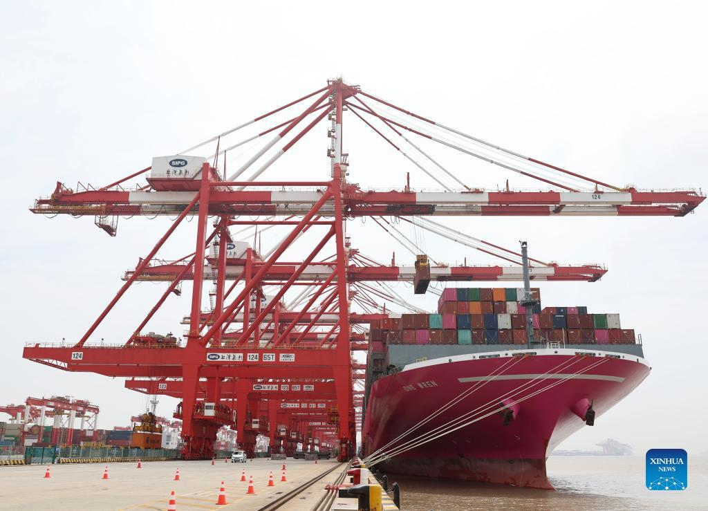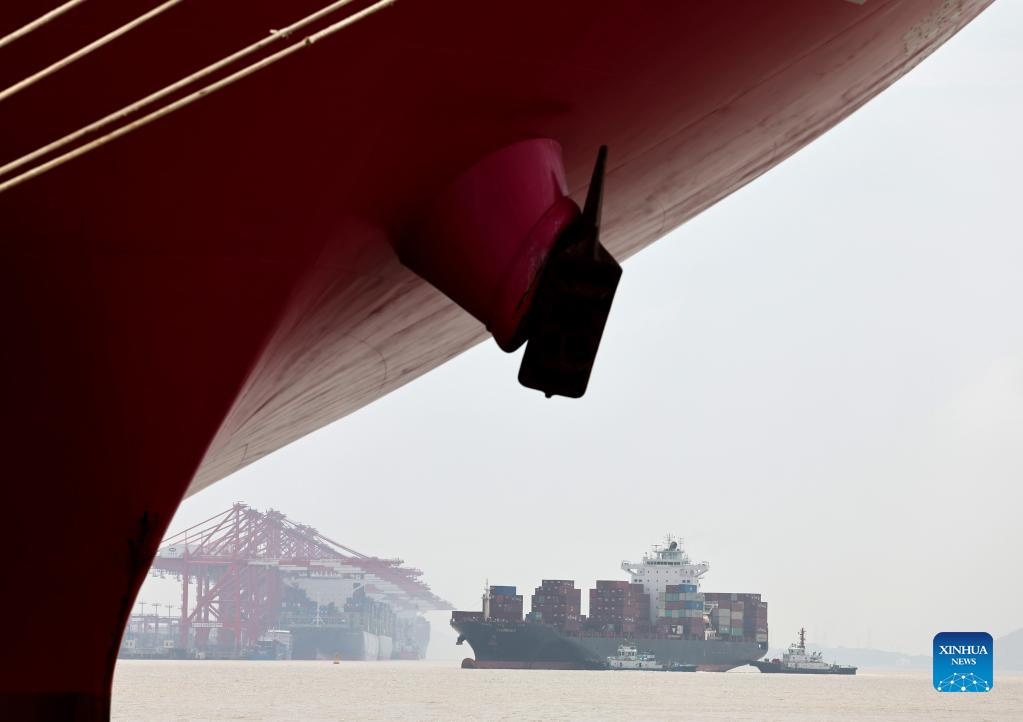 A container ship from Japan is seen at the container dock of Shanghai's Yangshan Port in east China, April 27, 2022. About 25,000 staff members stick to their posts in Shanghai port to guarantee water transportation and improve logistics efficiency amid challenges caused by the recent resurgence of COVID-19 in Shanghai. (Xinhua/Chen Jianli)