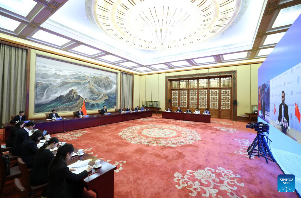 Li Zhanshu, chairman of the National People's Congress Standing Committee, holds virtual talks with Masud Gharahkhani, president of the Norwegian parliament, at the Great Hall of the People in Beijing, capital of China, April 27, 2022. (Xinhua/Ding Lin)