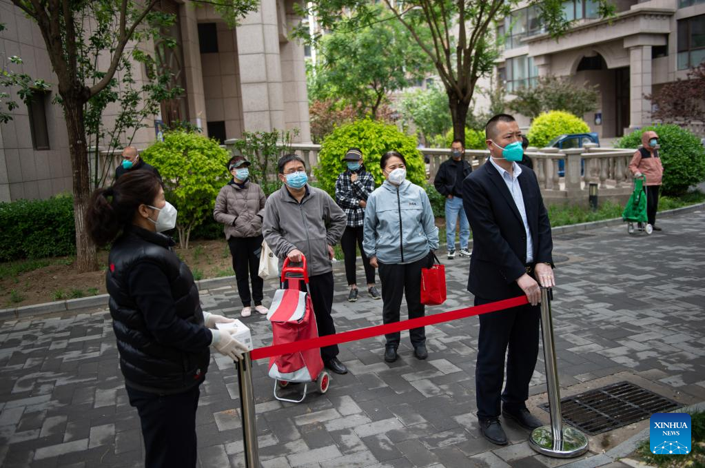 Community workers keep residents in good order to buy daily necessities in a community in Chaoyang District of Beijing, capital of China, April 28, 2022.