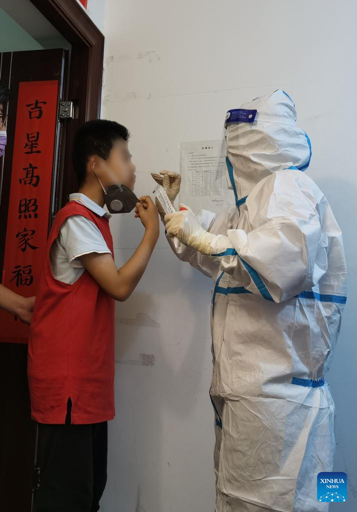 A medical worker takes a swab sample from a resident for nucleic acid testing inside a residential building in a community in Haidian District of Beijing, capital of China, April 26, 2022.
