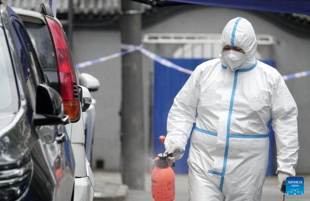 A sub-district worker disinfects vehicles in a community in Chaoyang District of Beijing, capital of China, April 28, 2022.