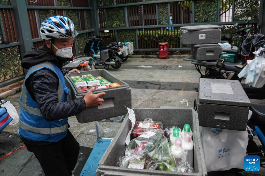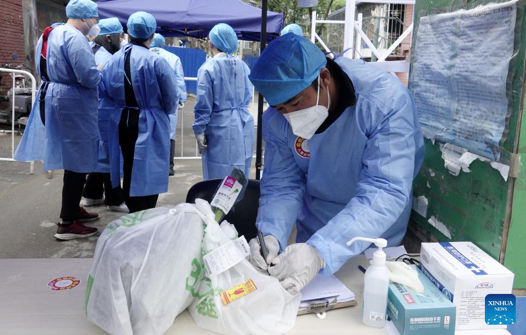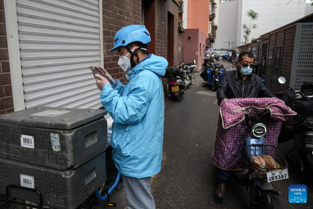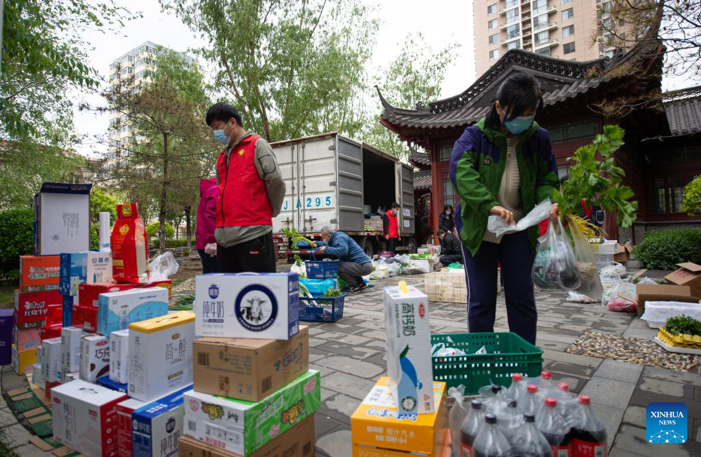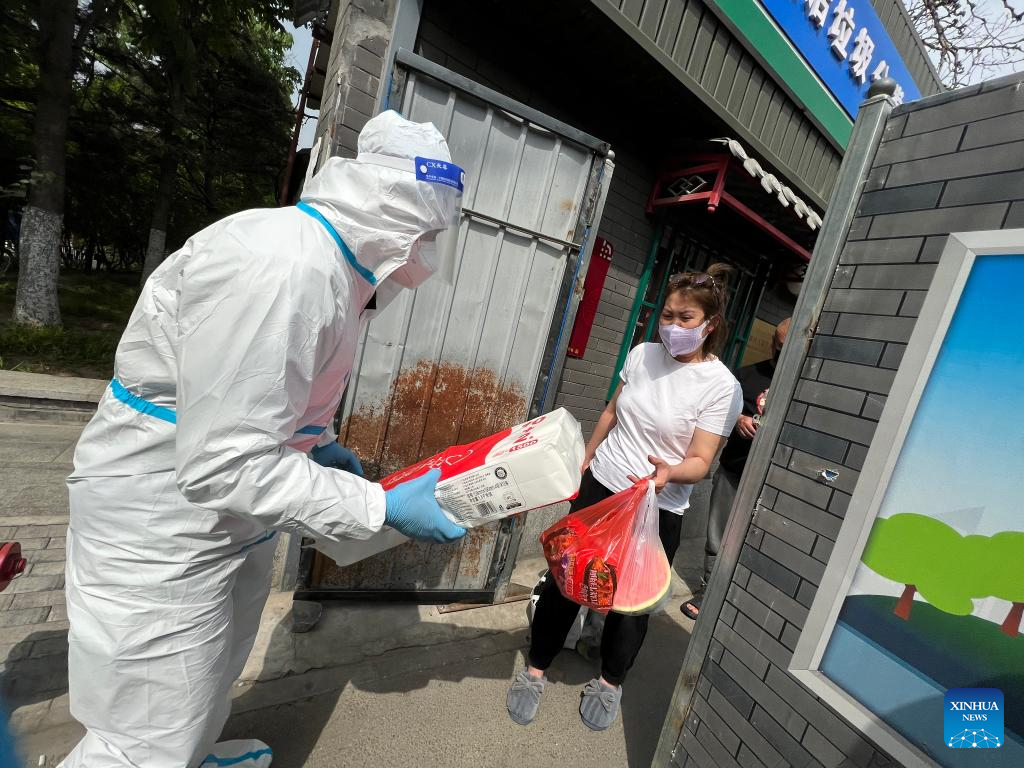 A community worker delivers daily necessities to residents in a community in Xicheng District of Beijing, capital of China, April 24, 2022.