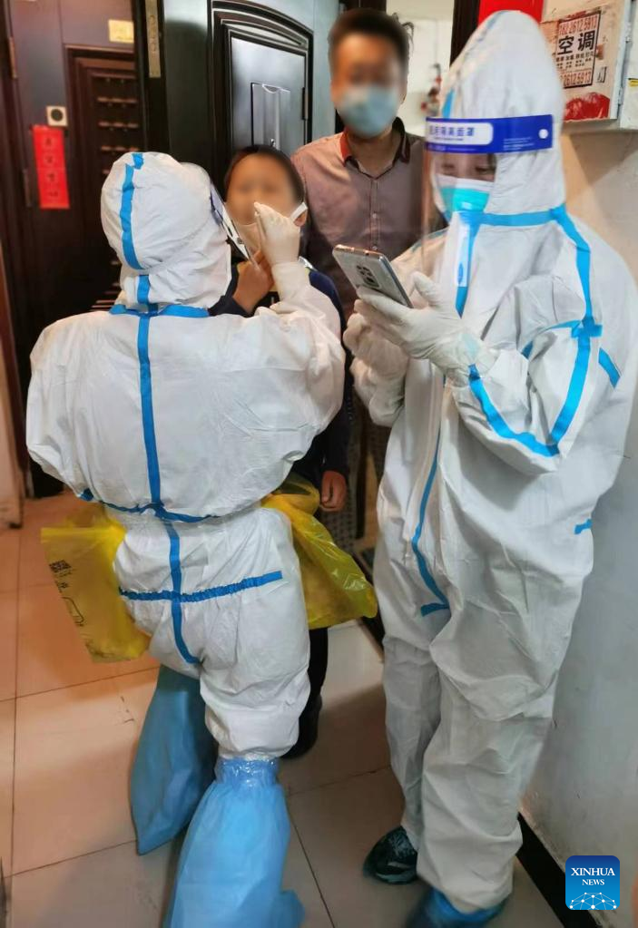 Medical workers go door-to-door to take swab samples for nucleic acid testing in Xicheng District of Beijing, capital of China, April 24, 2022.