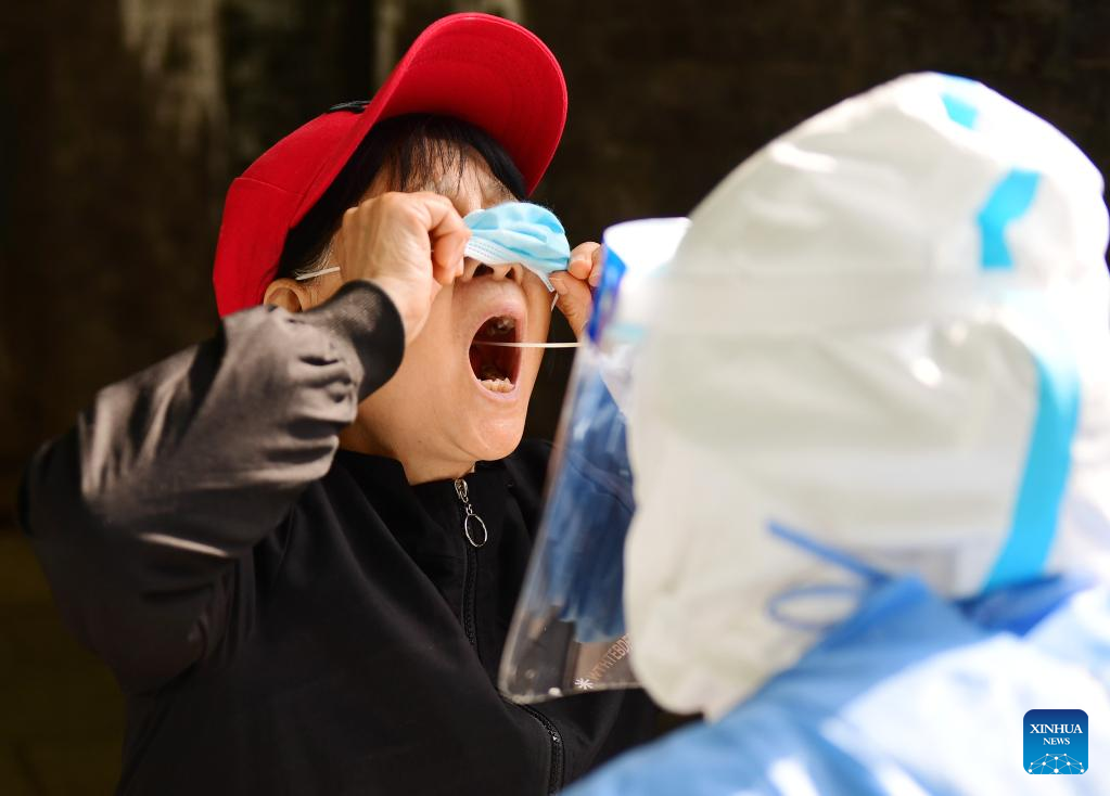 A medical worker takes a swab sample from a resident for nucleic acid testing at a COVID-19 test site in Dongcheng District of Beijing, capital of China, April 28, 2022.