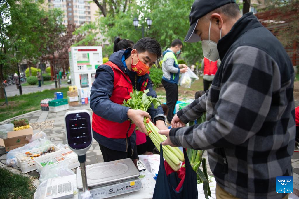 A resident (2nd L) buys vegetables at a temporary stand selling daily necessities in a community in Chaoyang District of Beijing, capital of China, April 28, 2022.