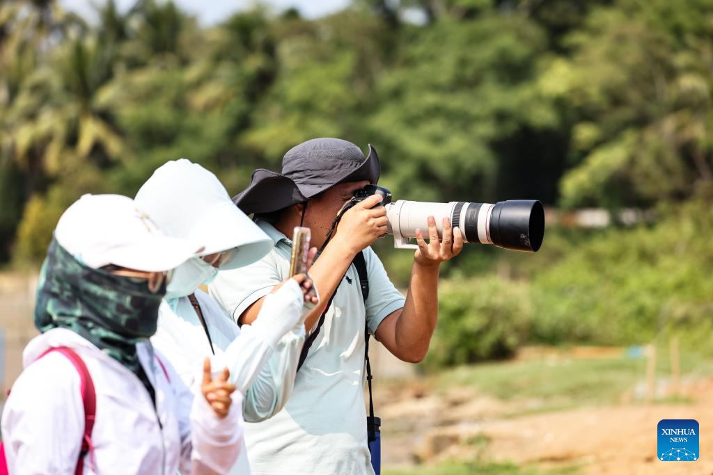 Staff members and volunteers monitor birds at Dongzhaigang National Nature Reserve, south China's Hainan Province, April 27, 2022. Dongzhaigang National Nature Reserve, the first wetland nature reserve dominating mangrove forest in China, started to conduct bird diversity monitoring in order to learn the changes and rules of bird population here. (Xinhua/Zhang Liyun)
