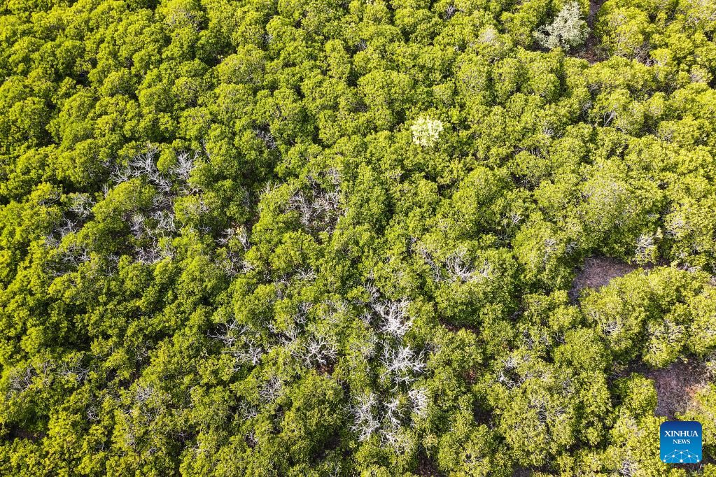 Aerial photo taken on April 27, 2022 shows Dongzhaigang National Nature Reserve, south China's Hainan Province. Dongzhaigang National Nature Reserve, the first wetland nature reserve dominating mangrove forest in China, started to conduct bird diversity monitoring in order to learn the changes and rules of bird population here. (Xinhua/Zhang Liyun)