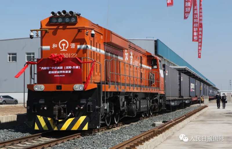 Photo taken on April 22, 2022 shows the opening ceremony of the first freight train connecting Shenyang, northeast China’s Liaoning Province and Laos, being held at a railway station in Shenyang. (People’s Daily/Zhao Jingdong)