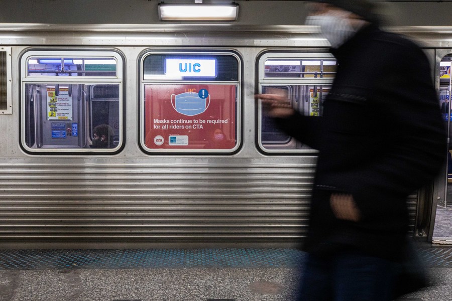 A sign reminding passengers to wear face masks is seen on the window of a subway train in Chicago, the United States, on Feb. 28, 2022. (Photo by Vincent D. Johnson/Xinhua)