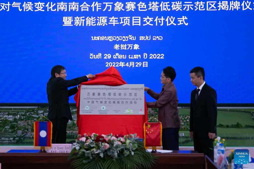 VIENTIANE, April 30 (Xinhua) -- The inauguration ceremony of the Vientiane Saysettha Low-Carbon Demonstration Zone jointly built by China and Laos was held via video conferencing on Friday.