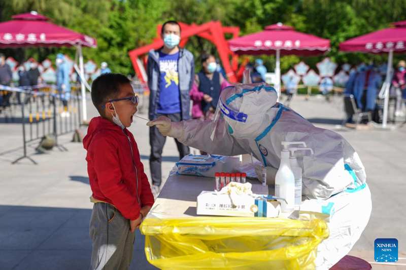 A medical worker takes a swab sample from a resident for nucleic acid testing in Daxing District, Beijing, capital of China, April 30, 2022. Many districts of Beijing on Saturday launched the third round of nucleic acid testing amid efforts to contain the recent resurgence of COVID-19 cases in the city. (Xinhua/Peng Ziyang)