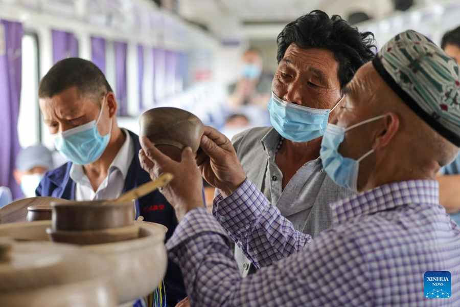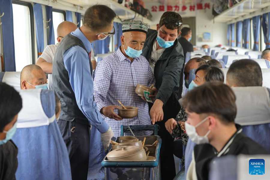 Passengers choose handicrafts aboard a slow train running in northwest China's Xinjiang Uygur Autonomous Region, April 28, 2022.