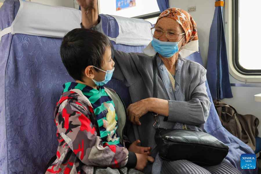 A senior passenger talks with a kid aboard a slow train bound for Hotan in northwest China's Xinjiang Uygur Autonomous Region, April 27, 2022.
