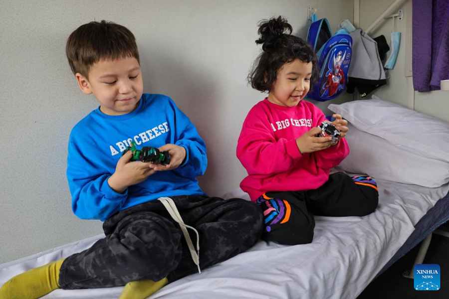Children play toys aboard a slow train bound for Hotan in northwest China's Xinjiang Uygur Autonomous Region, April 27, 2022.