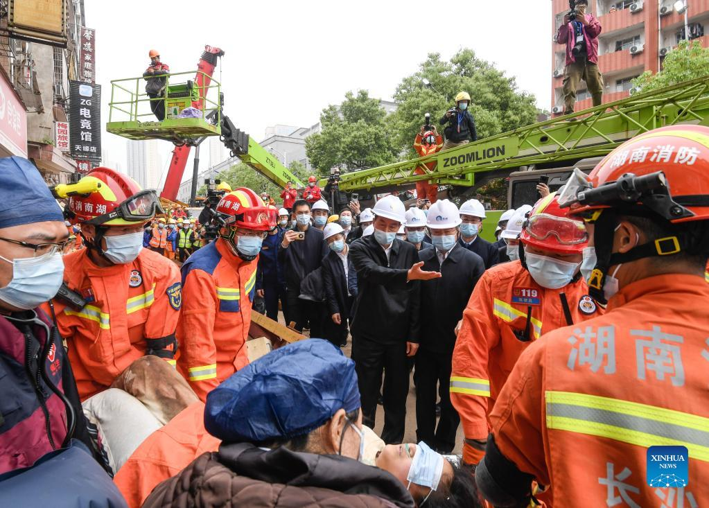 State Councilor Wang Yong guides the search and rescue work at the collapse site of a self-constructed residential building in Changsha, central China's Hunan Province, May 1, 2022. (Xinhua/Shen Hong)
