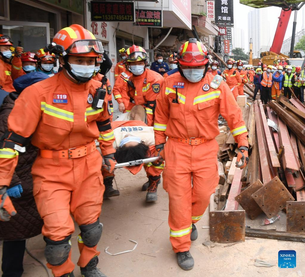 Rescuers work at the collapse site of a self-constructed residential building in Changsha, central China's Hunan Province, May 1, 2022. Six people have been rescued after a self-constructed residential building collapsed Friday in central China's Hunan Province. The incident took place at 12:24 p.m. in Wangcheng District in Changsha. Further investigations are underway. (Xinhua/Shen Hong)