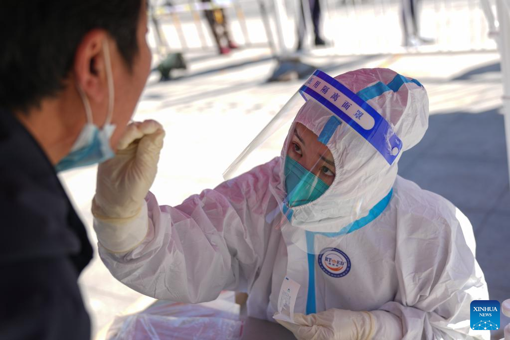 A medical worker takes a swab sample from a resident for nucleic acid testing in Daxing District, Beijing, capital of China, April 30, 2022. (Xinhua/Peng Ziyang)