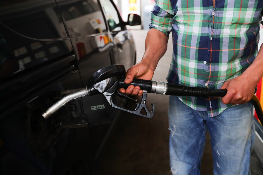A man fills the tank of a car at a gas station in Brussels, Belgium, March 29, 2022. (Xinhua/Zheng Huansong)