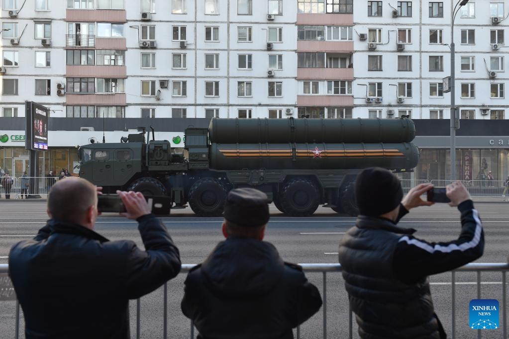 People take pictures of a military vehicle driven in a rehearsal of the upcoming Victory Day parade in Moscow, Russia, on May 4, 2022. (Photo by Alexander Zemlianichenko Jr/Xinhua)