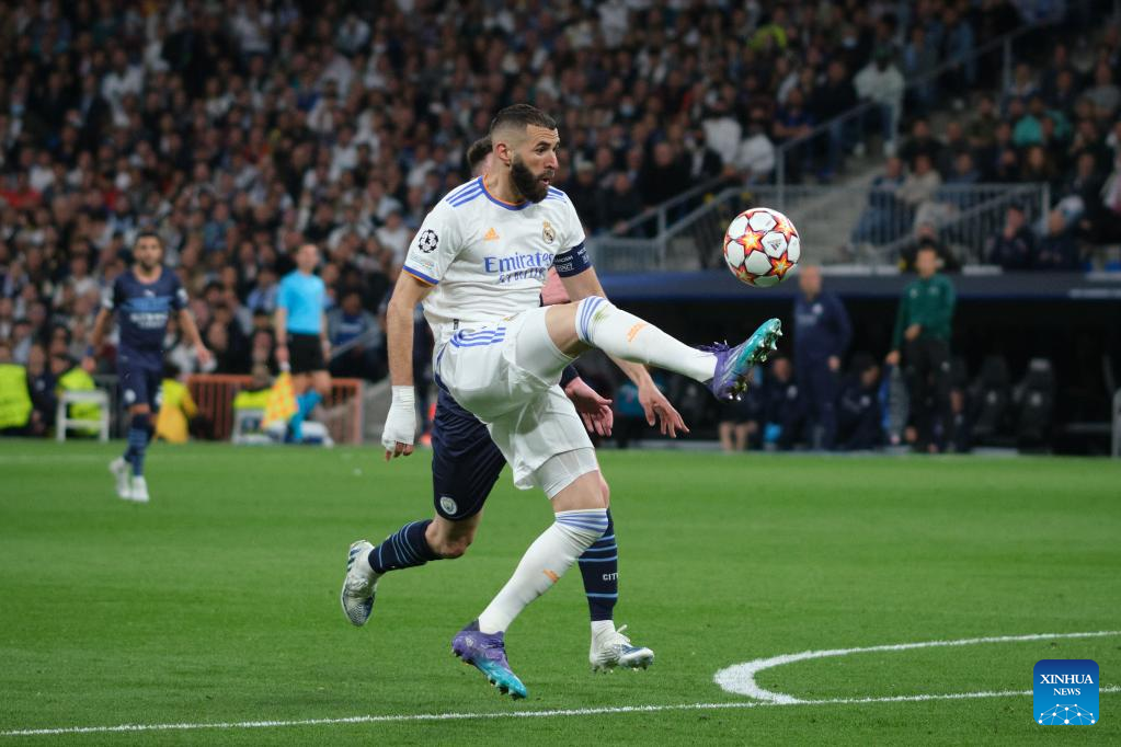 Real Madrid's Karim Benzema competes during the UEFA Champions League semifinal second leg football match between Real Madrid of Spain and Manchester City of England in Madrid, Spain, May 4, 2022. (Xinhua/Meng Dingbo)