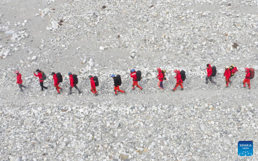Members of a Chinese scientific expedition team are on the way back to the Mount Qomolangma base camp on May 5, 2022. A Chinese scientific expedition team returned safely to the Mount Qomolangma base camp on Thursday, after reaching the summit of the world's highest peak. All 13 members of the expedition team are in good physical condition. (Xinhua/Sun Fei)