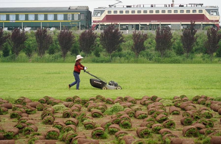A villager trims a lawn from which commercial turfs are planted in Fujiang Village of Yinzhen Neighbourhood in Xi'an, northwest China's Shaanxi Province. The need for turfs during China's urbanization process has driven farmers in Yinzhen Neighbourhood to invest in the turf business. (Xinhua/Shao Rui)