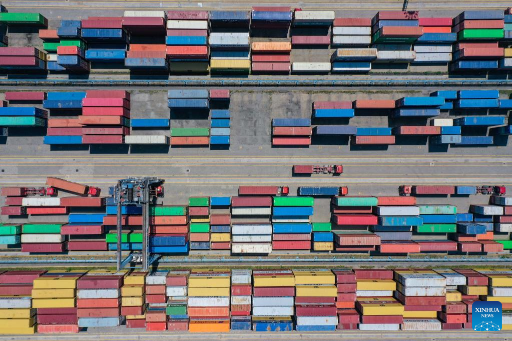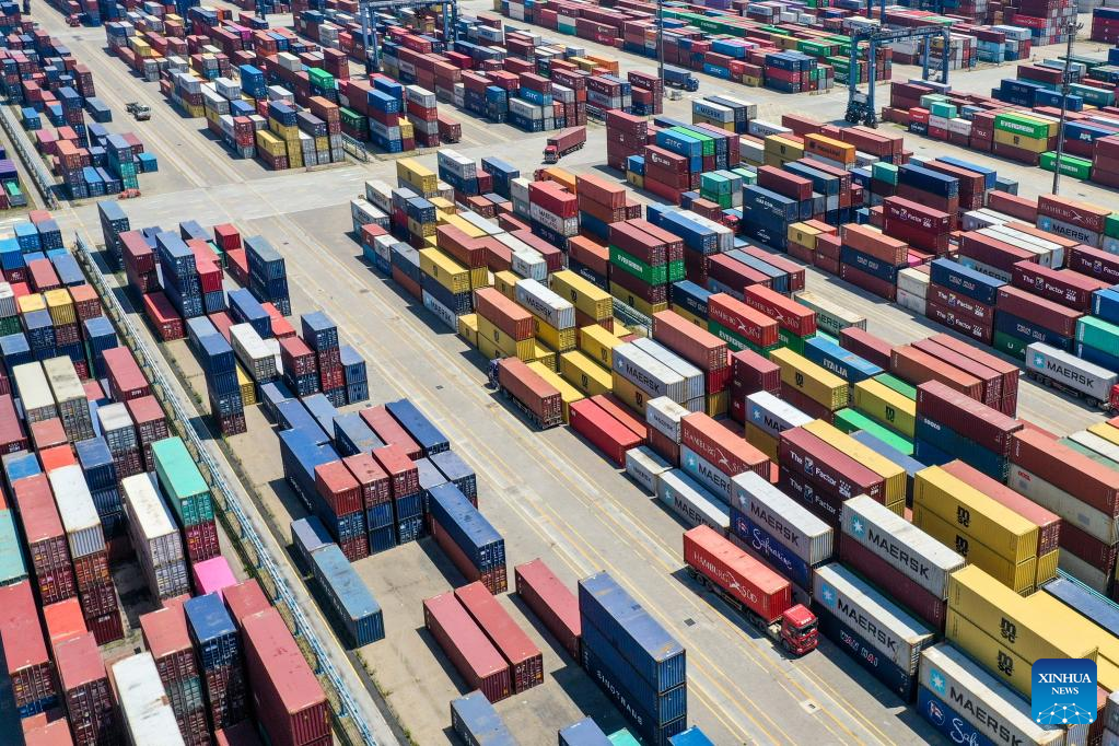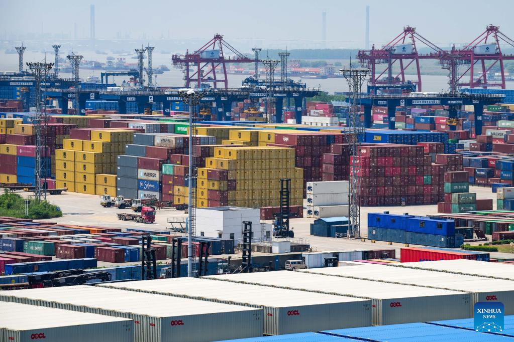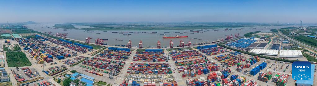 Aerial photo taken on May 6, 2022 shows a view of the Longtan Container Terminal of Nanjing Port in Nanjing, Jiangsu province. Recently, in addition to epidemic prevention and control, Jiangsu Port Group has made efforts in the transportation of people's livelihood materials and important production materials, so as to ensure the safety and stability of the industrial chain and supply chain. (Xinhua/Li Bo)