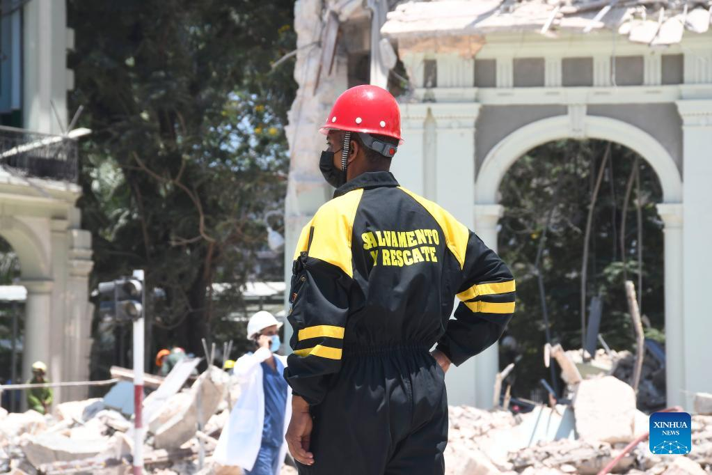 A rescuer works at the site where an explosion occurred at Hotel Saratoga in Havana, Cuba, on May 6, 2022. At least eight people were killed and over 30 others injured after an explosion ripped through the hotel in downtown Havana Friday morning, official sources reported. (Photo by Joaquin Hernandez/Xinhua)